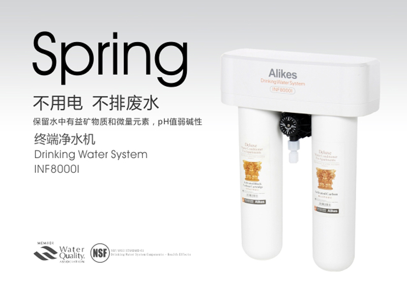 Alikes凈水機是對市政自來水或可以飲用的地下水進(jìn)行二次深度凈化處理的終端水處理設(shè)備,出水品質(zhì)符合衛(wèi)生部《生活飲用水水質(zhì)衛(wèi)生規(guī)范》(2001)的規(guī)定。凈水機利用市政管道自來水的壓力驅(qū)動水流,通過獨特的濾芯來達(dá)到生飲的標(biāo)準(zhǔn)。去除水中的泥沙、******、鐵銹、懸浮物、有害重金屬、余氯、異色和異味。不需用電,不產(chǎn)生廢水,即用即飲,不需儲水罐避免二次污染。內(nèi)置流量計根據(jù)用水量自動斷水確保飲水健康。是凈水機中的高端產(chǎn)品。
