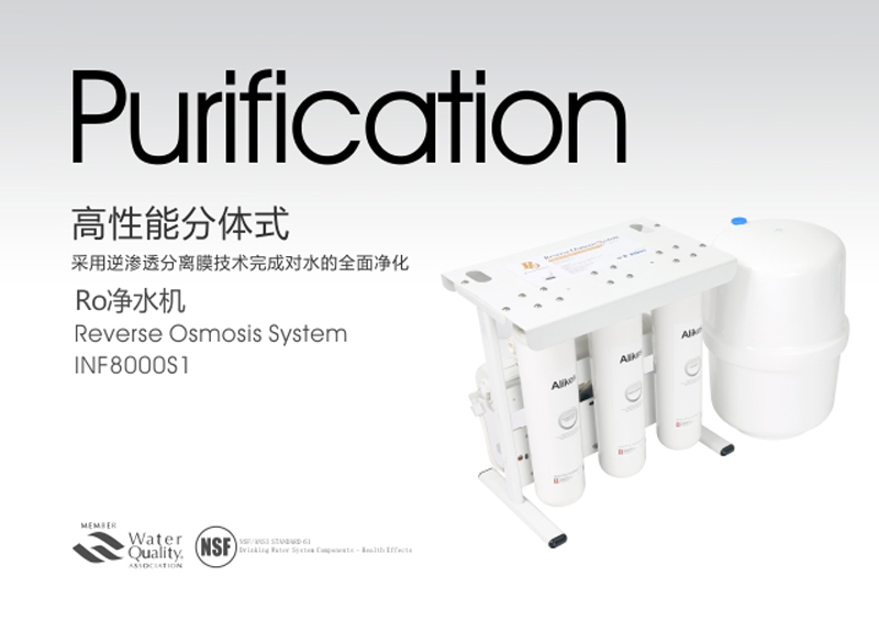 Alikes RO凈水機是對市政自來水或可以飲用的地下水進行二次深度凈化處理的終端水處理設備,出水品質(zhì)符合衛(wèi)生部《生活飲用水水質(zhì)衛(wèi)生規(guī)范》(2001)的規(guī)定。凈水機應用了******進的逆滲透分離膜的技術,依靠增壓泵對原水施加壓力,使原水透過逆滲透膜,把原水中細微雜質(zhì)、過多的無機鹽、有機物、重金屬離子、******、病毒、農(nóng)藥、三氯甲烷致癌物等有害物質(zhì)截留,并通過連續(xù)排放的濃水出口(污水排放口)將這些水中有害異物排出。進而完成對水質(zhì)的******凈化。